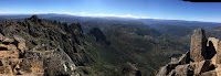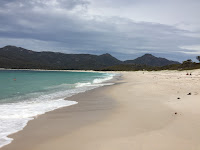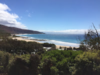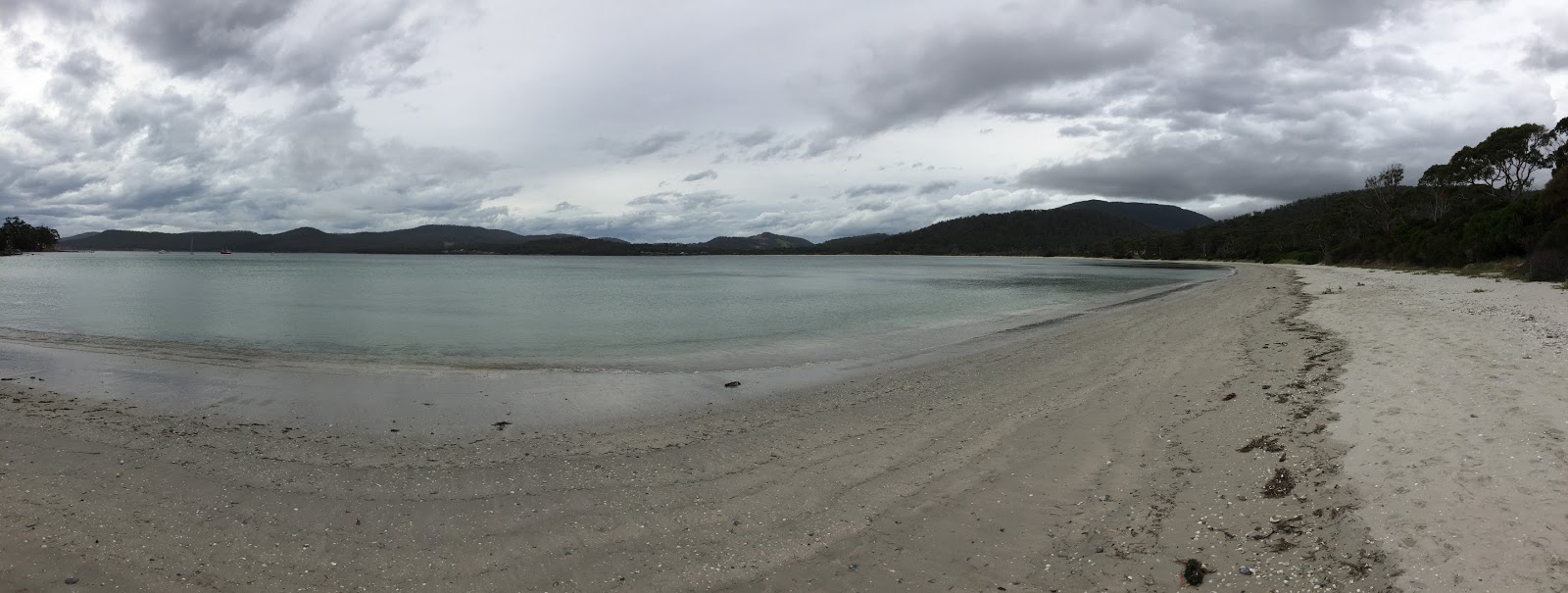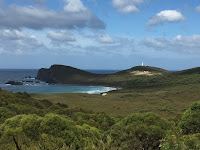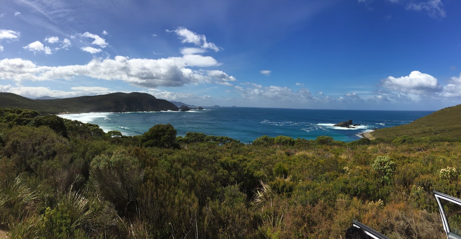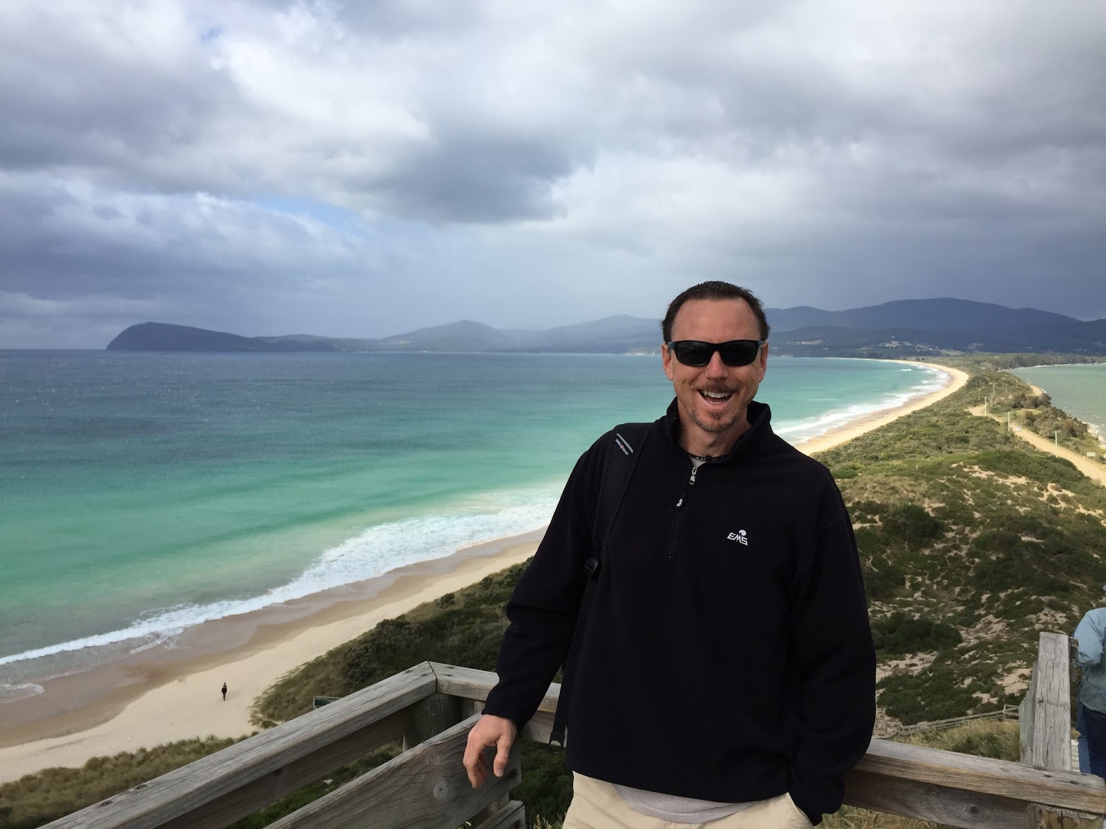 Bruny Island (Google, Images, Web Page) is an island off the south-eastern coast of Tasmania….or as Rick’s son Josh said, “so you went to an island, off of an island (Tasmania), off of an island nation (Australia)”….yeah, that’s it. 🙂 According to Wiki, “Geologically, Bruny Island is actually two land masses – North Bruny and South Bruny – that are joined by a long, narrow sandy isthmus” (isthmus = “a narrow strip of land with sea on either side, forming a link between two larger areas of land”). My first stop after reaching Bruny Island was the lookout at the “Neck” (the isthmus). It was very beautiful and VERY windy. Seriously, we’re talking tropical storm winds here….crazy windy. But the view from the top of the dunes was well worth it…..