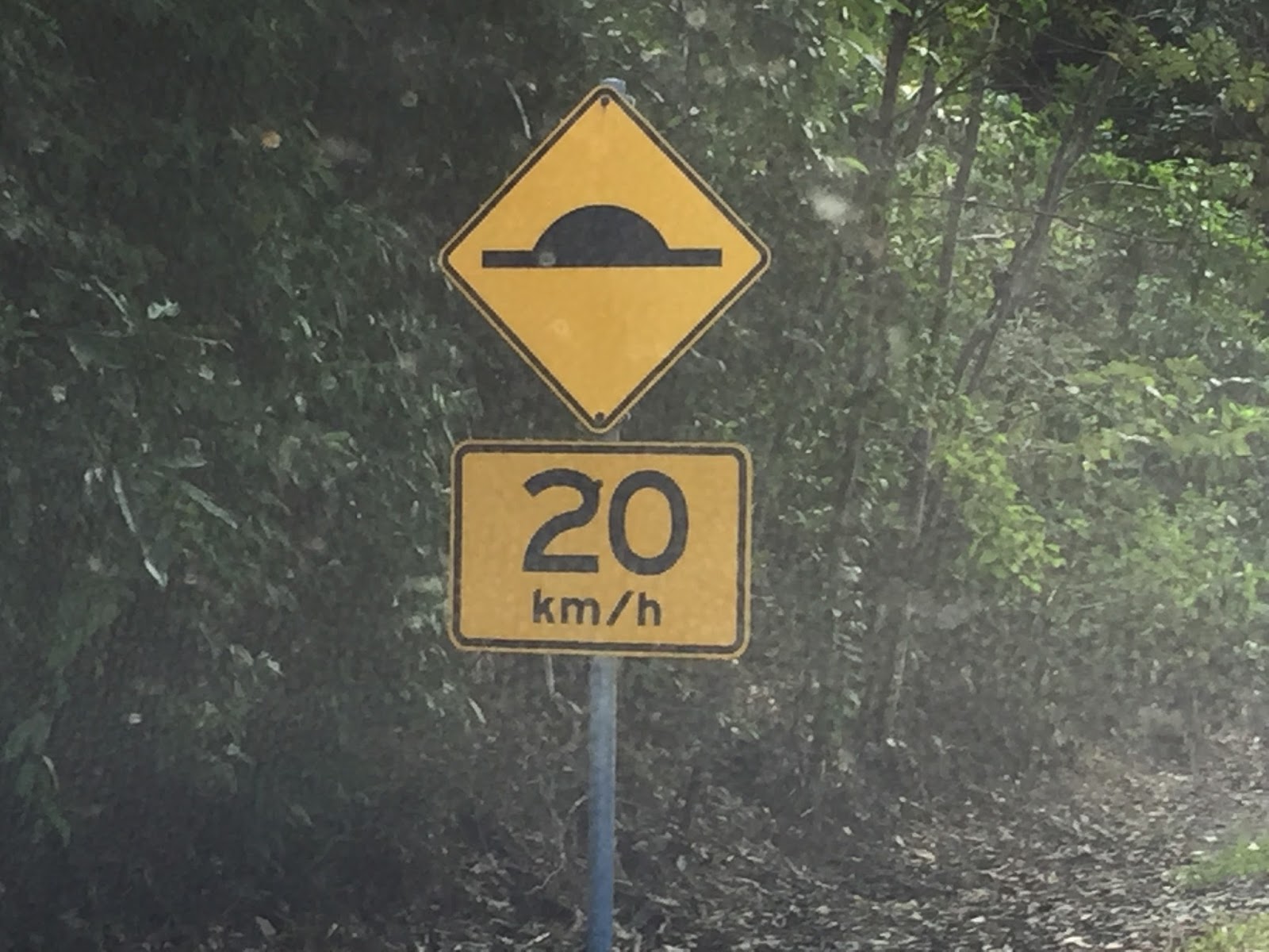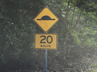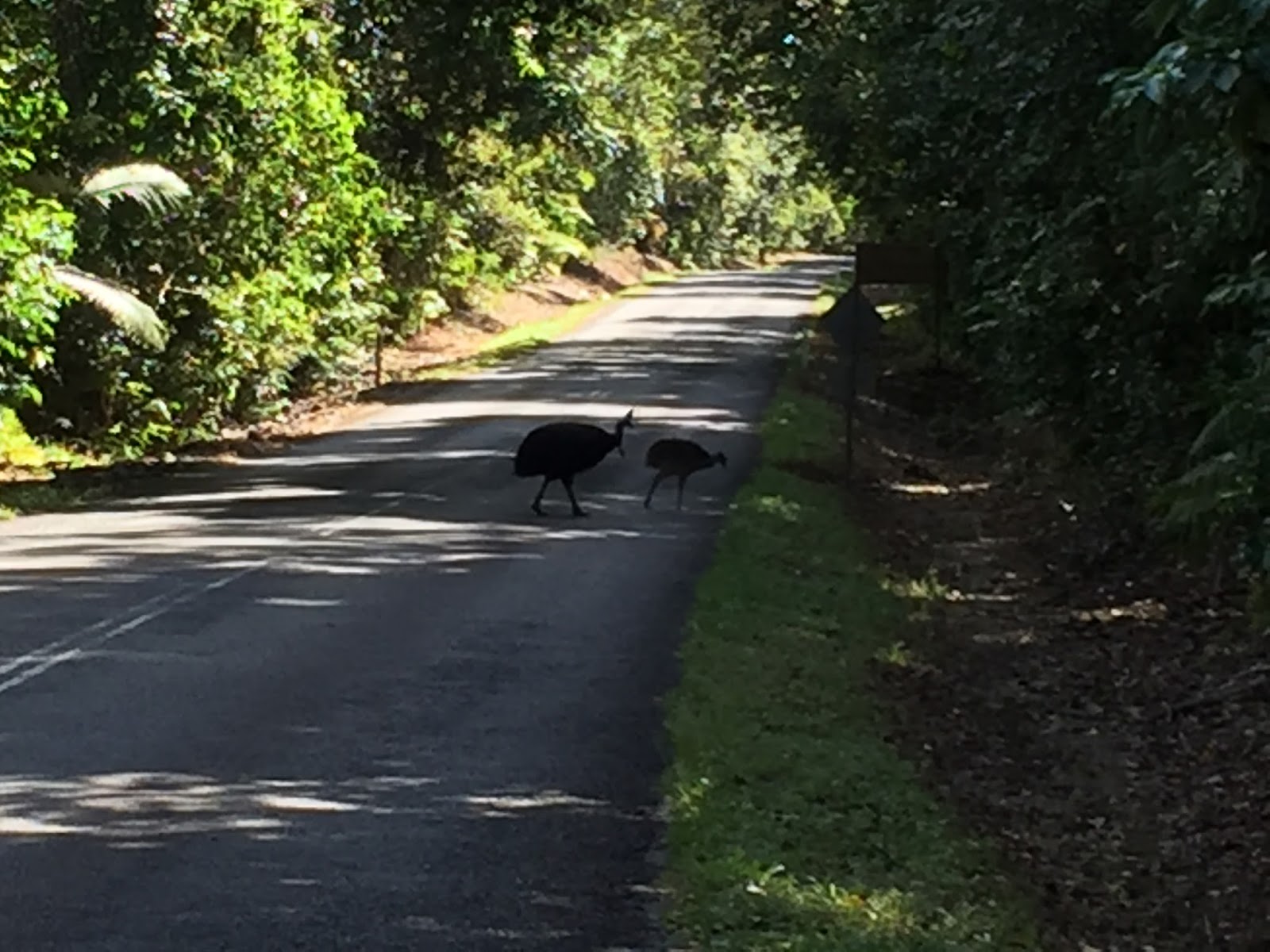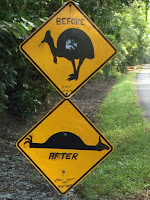 I watched them until they walked off into the bush and then made my way back to my car. Just before I got into my car I saw them crossing the road. I see why there are “slow down” signs everywhere around here….someone “edited” a speed bump sign (below) and added it to a Cassowary sign for a humorous way to get folks to slow down…..